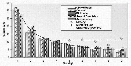 But, as Dr. Benford discovered, in a huge assortment of number sequences — random samples from a day's stock quotations, a tournament's tennis scores, the numbers on the front page of The New York Times, the populations of towns, electricity bills in the Solomon Islands, the molecular weights of compounds the half-lives of radioactive atoms and much more — this is not so.