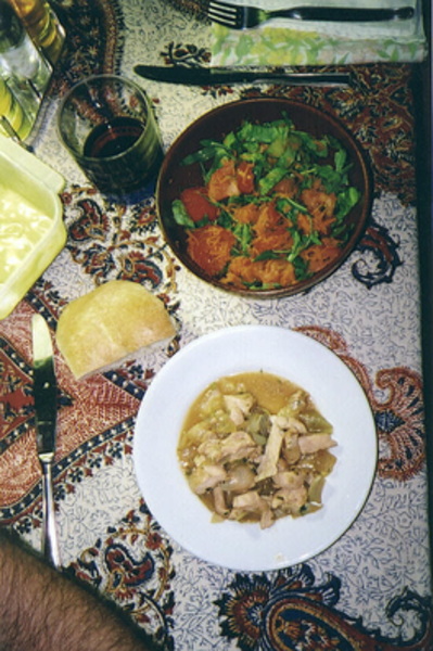 Later in the same meal: Secondo was a hearty chicken stew, along with a salad of whatever was fresh and available. Renzo was firmly of the opinion that Bears are always in need of food; he'd generally eat like a bird and watch us consume the product of his labors. So, we'll be seeing large portions set against this tablecloth.